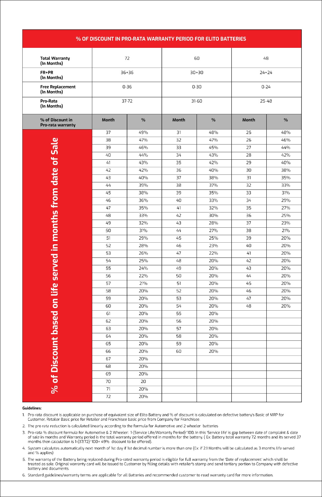 Pro-rata discount is applicable on purchase of equivalent size of Elito Battery and % of discount is calculated on defective battery’s Basic of MRP for Customer, Retailer Basic price for Retailer and Franchisee basic price from Company for Franchisee.